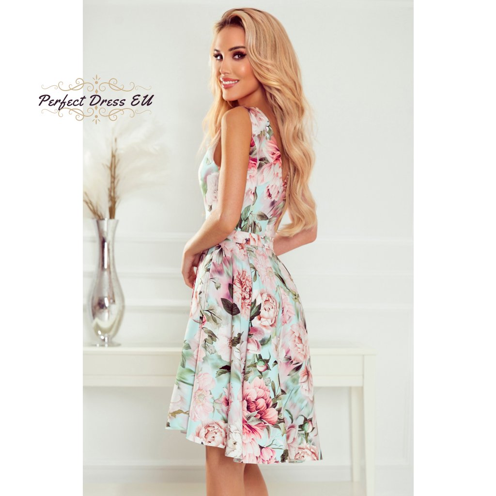 Maya - asymetrické šaty s delšími zády, výstřihem a páskem. Vzor: růžové květy na mátovém pozadí. Na tanec se bude skvěle hodit sukně s delším zadním dílem. Polská výroba. Značka Numoco.