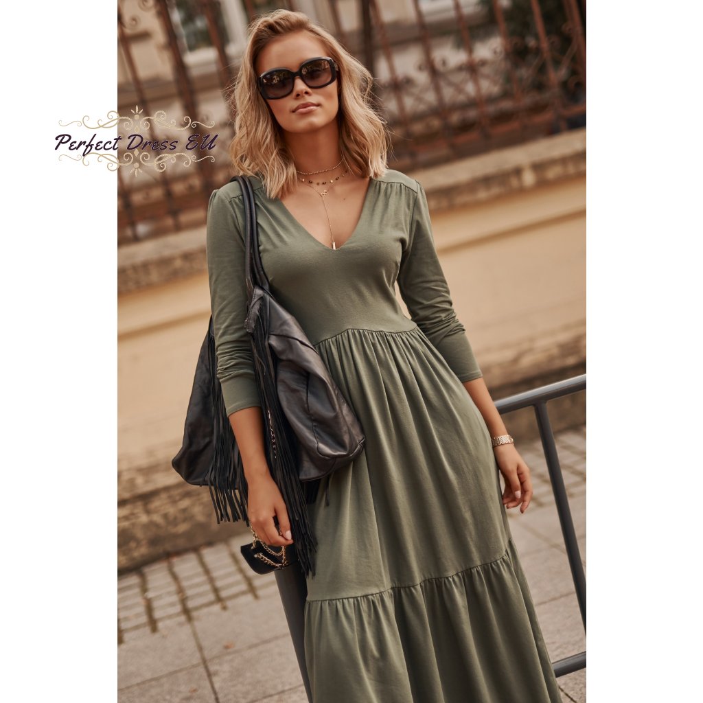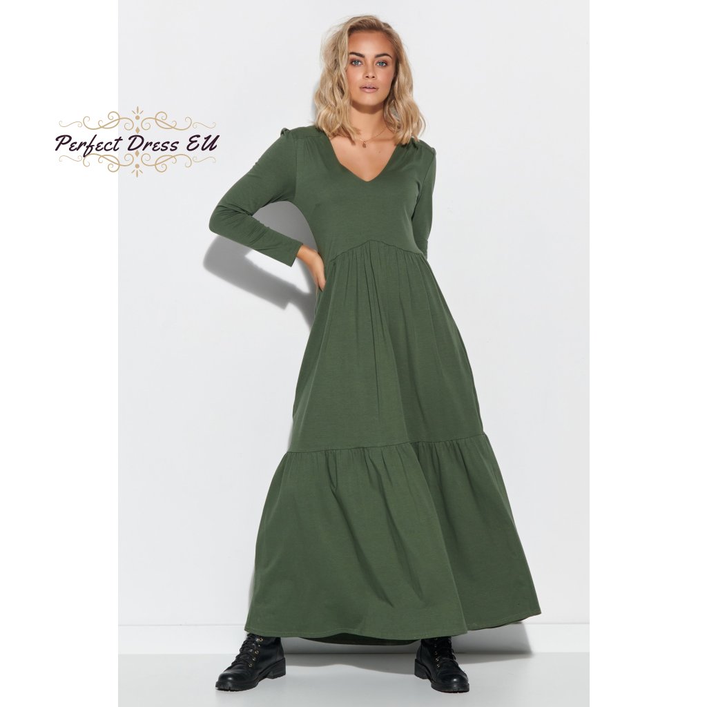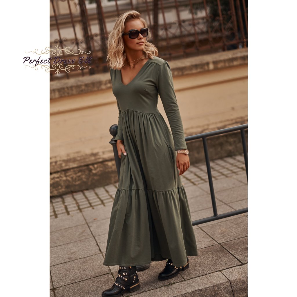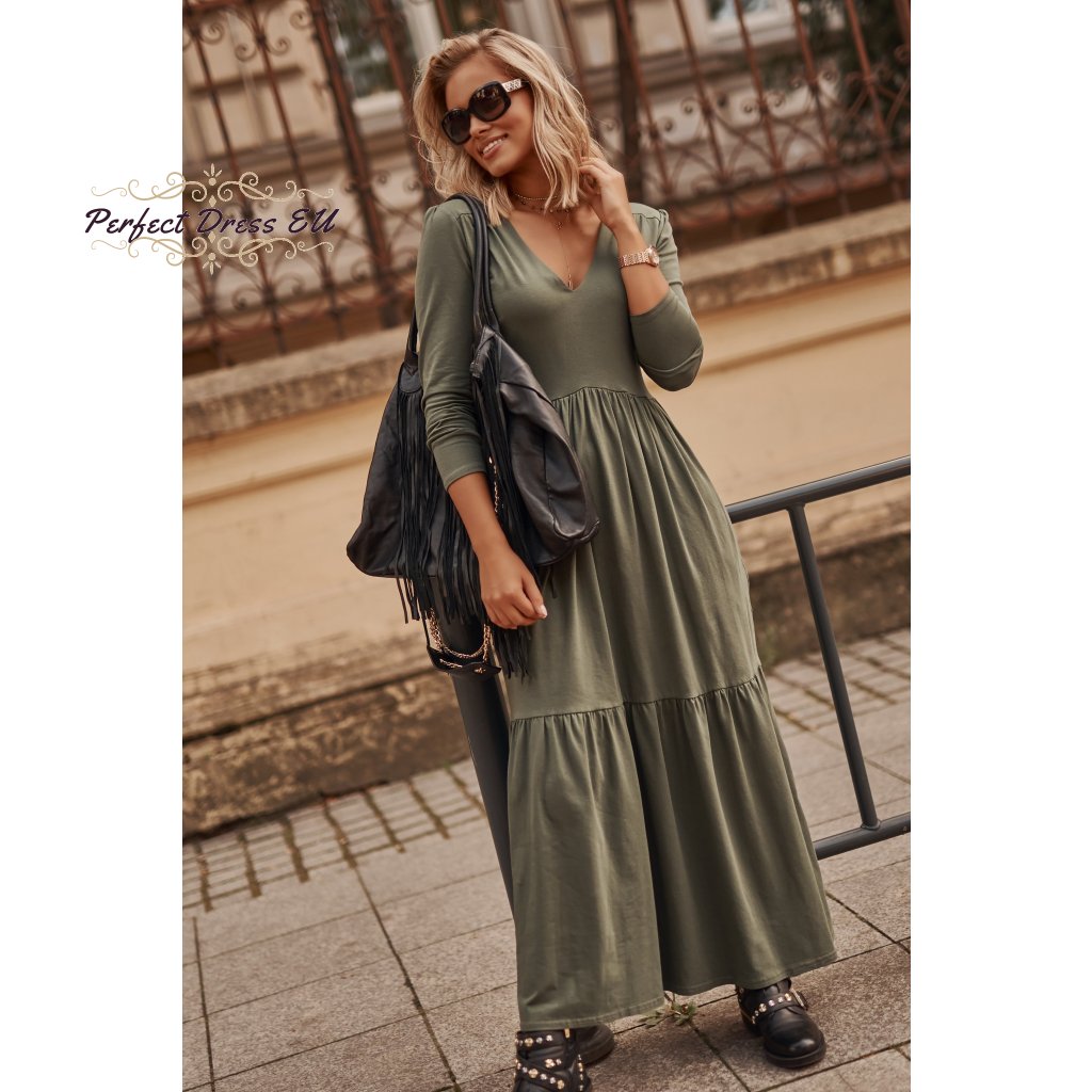Dámské maxi šaty s dlouhými rukávy a výstřihem do V. Šaty jsou vyrobeny z kvalitní bavlny se žerzejem, což je ideální řešení pro téměř každé roční období. Šaty jsou dlouhé a navzdory jednoduchému střihu působí úžasným dojmem. Výstřih do V prodlužuje krk a zdůrazňuje dekolt, zatímco dlouhé rukávy zužují ramena. Šaty jsou pod poprsím odříznuté, takže zakryjí nedokonalosti kolem břicha, stehen a hýždí. Ve spodní části je použit dekorativní vodorovný lem. Model je k dispozici ve dvou barvách: černé a khaki.| velikostní tabulka | 36/38 | 40/42 | 44/46 |