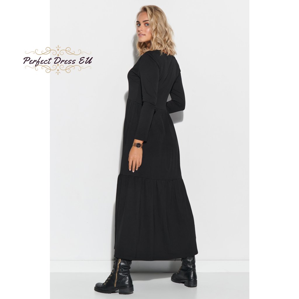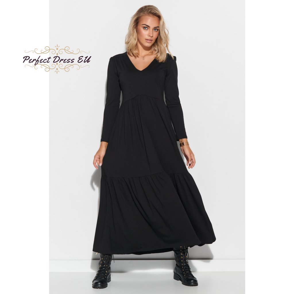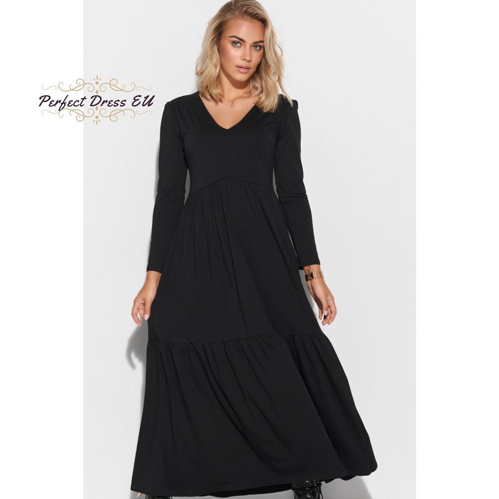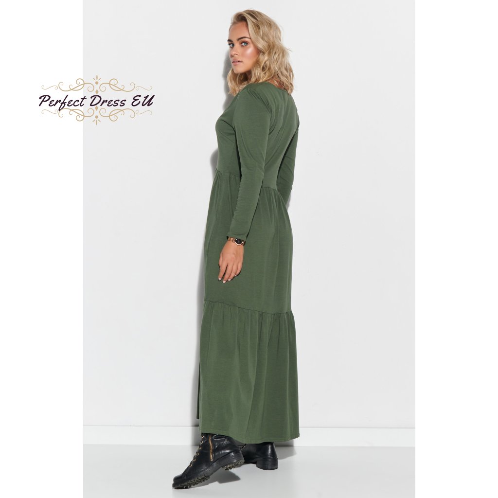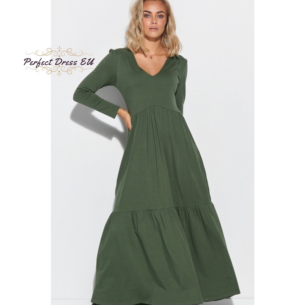Dámské maxi šaty s dlouhými rukávy a výstřihem do V. Šaty jsou vyrobeny z kvalitní bavlny se žerzejem, což je ideální řešení pro téměř každé roční období. Šaty jsou dlouhé a navzdory jednoduchému střihu působí úžasným dojmem. Výstřih do V prodlužuje krk a zdůrazňuje dekolt, zatímco dlouhé rukávy zužují ramena. Šaty jsou pod poprsím odříznuté, takže zakryjí nedokonalosti kolem břicha, stehen a hýždí. Ve spodní části je použit dekorativní vodorovný lem. Model je k dispozici ve dvou barvách: černé a khaki.| velikostní tabulka | 36/38 | 40/42 | 44/46 |