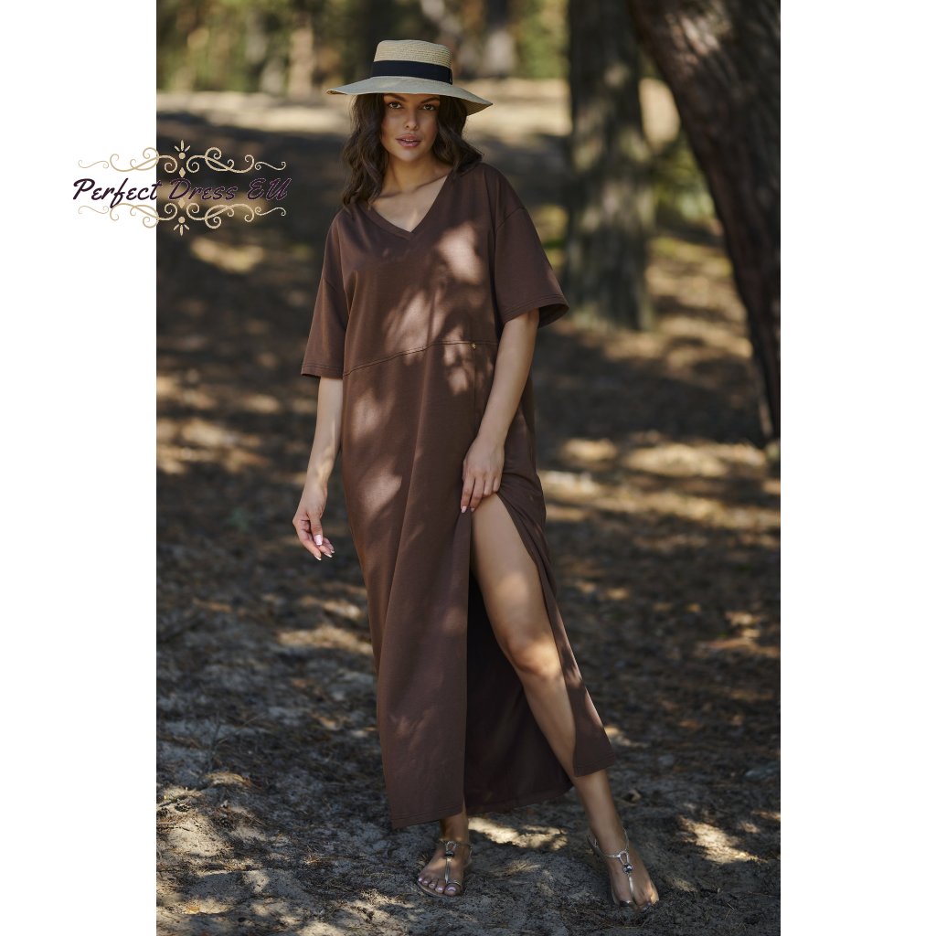 Volné dlouhé šaty s krátkým rukávem dodávají šarm a nadčasový styl. Šaty potěší rozparkem vpředu, který dodává nádech jemné elegance, a v linii pasu je zdobí ozdobná zlatá destička, která jemně soustředí pozornost na ženskou postavu. Výstřih do V zdůrazňuje krk a klíční kosti a dodává šatům ženský šarm. Zároveň velmi ležérní střih dělá ze šatů ideální volbu pro letní dny, zaručující nejen bezvadný vzhled, ale i pohodlí při nošení. K dispozici v různých barvách, jako je černá, čokoládová, khaki, světle béžová, minerální a korálová , je perfektní volbou pro ženy, které oceňují pohodlí a módu bez ohledu na trendy.Složení: 95% bavlna, 5% elastanRozměry produktu: