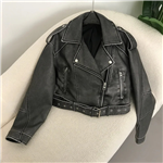 Krátká dámská koženková bunda s páskem a elegantním střihem