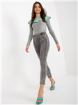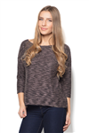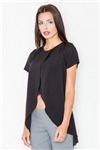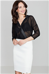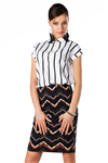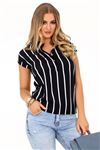 Elegantní jednoduchá halenka mírně vypasovaného střihu. Černá s ozdobným pruhovaným potiskem. Krátké rukávy zdobené řasením. Přední řasení s ozdobnými knoflíky a širší stojáček s knoflíkem