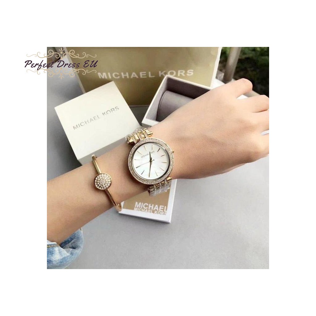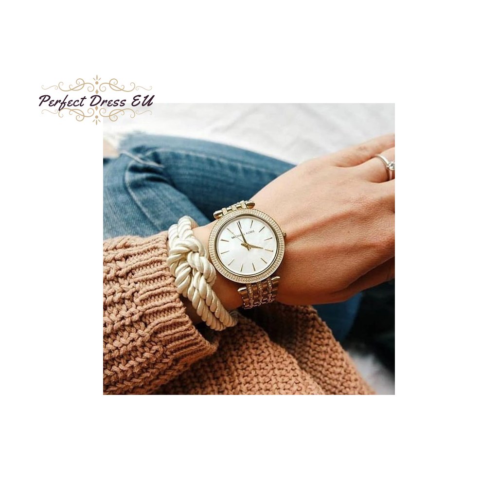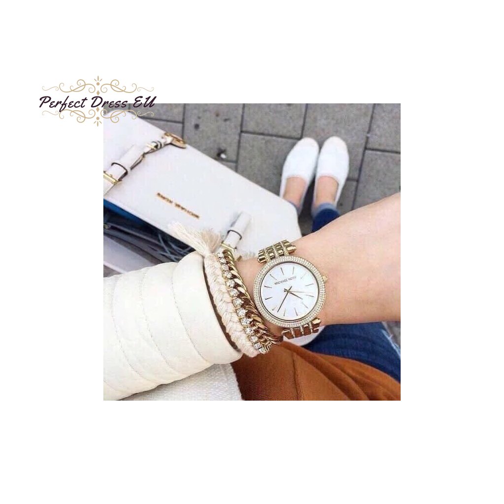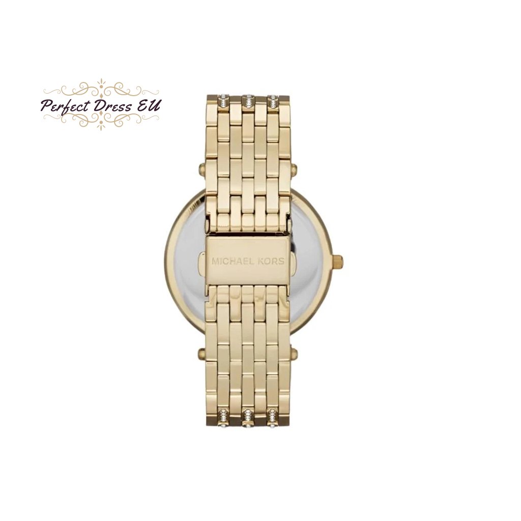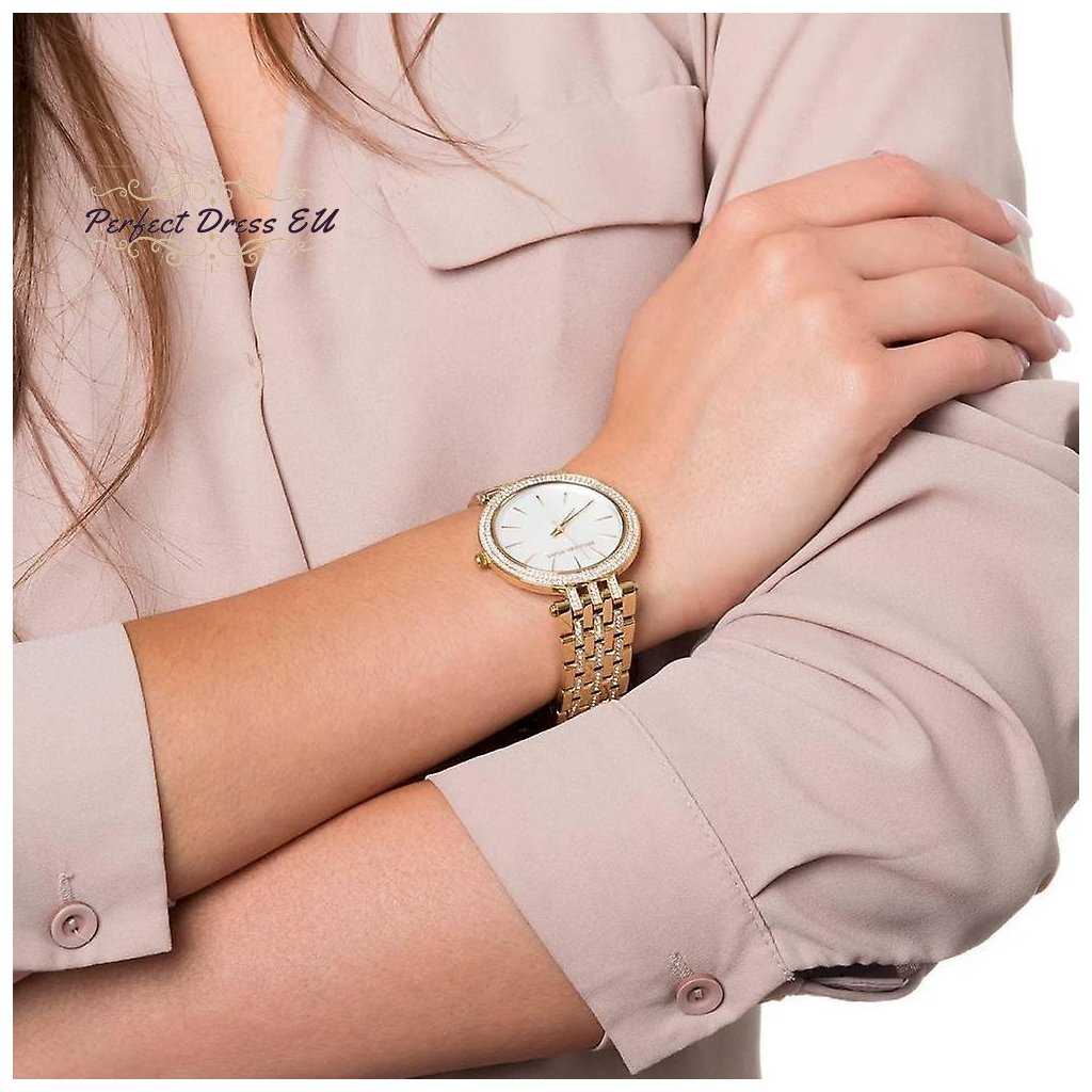 Dámské hodinky Michael Kors Darci MK3219 jsou stylovým klasickým modelem pro každou ženu. Jsou vyrobeny výhradně z nerezové oceli zlaté barvy s perleťovým ciferníkem, dodávají jim eleganci a zaručují dlouhou životnost. Přesný quartzový strojek napájený baterií zajišťuje spolehlivý chod.