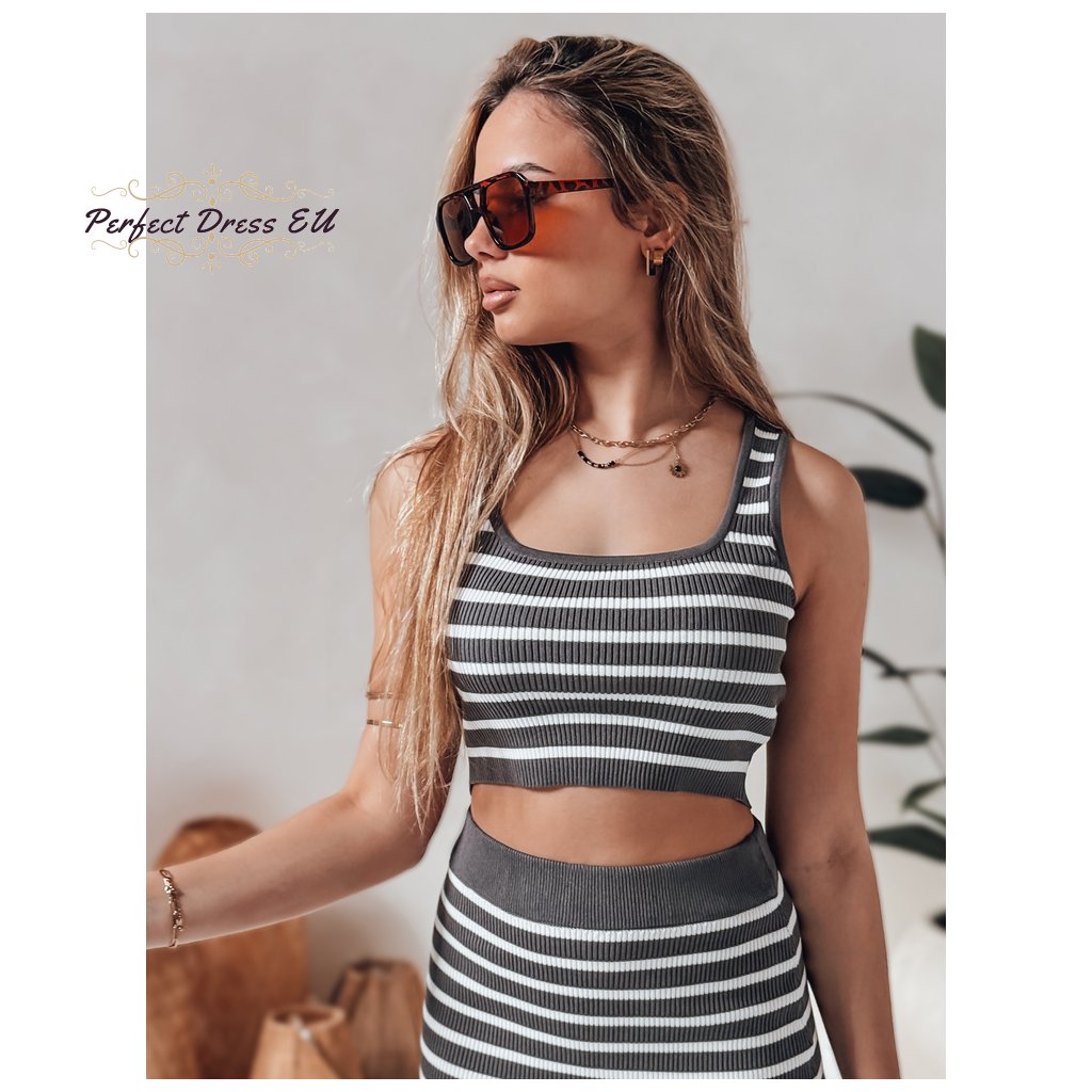 Dámský žebrovaný set je perfektní volbou pro teplejší dny. Crop top se silnějšími ramínky a klasickým výstřihem působí moderně, zatímco vypasovaná maxi sukně s vysokým pasem a efektním rozparkem dodává charakter. Pruhovaný vzor opticky zeštíhluje siluetu. Jedna velikost padne všem od XS po L. Materiál je příjemný na dotek, elastický a dokonale se přizpůsobí tělu a zajistí pohodlí při nošení v teplých dnech.