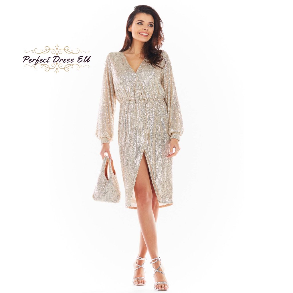 Flitrové midi šaty s výstřihem a rozparkem A399