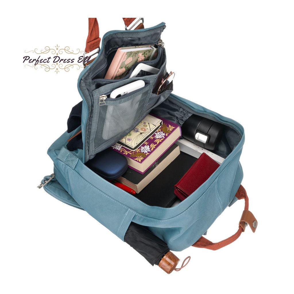 Batoh se vejde do formátu A4 . Velké množství kapes a přihrádek vám umožní uložit všechny nezbytnosti, jako je telefon, peněženka, sluneční brýle, láhev s vodou, malý deštník a mnoho dalšího.