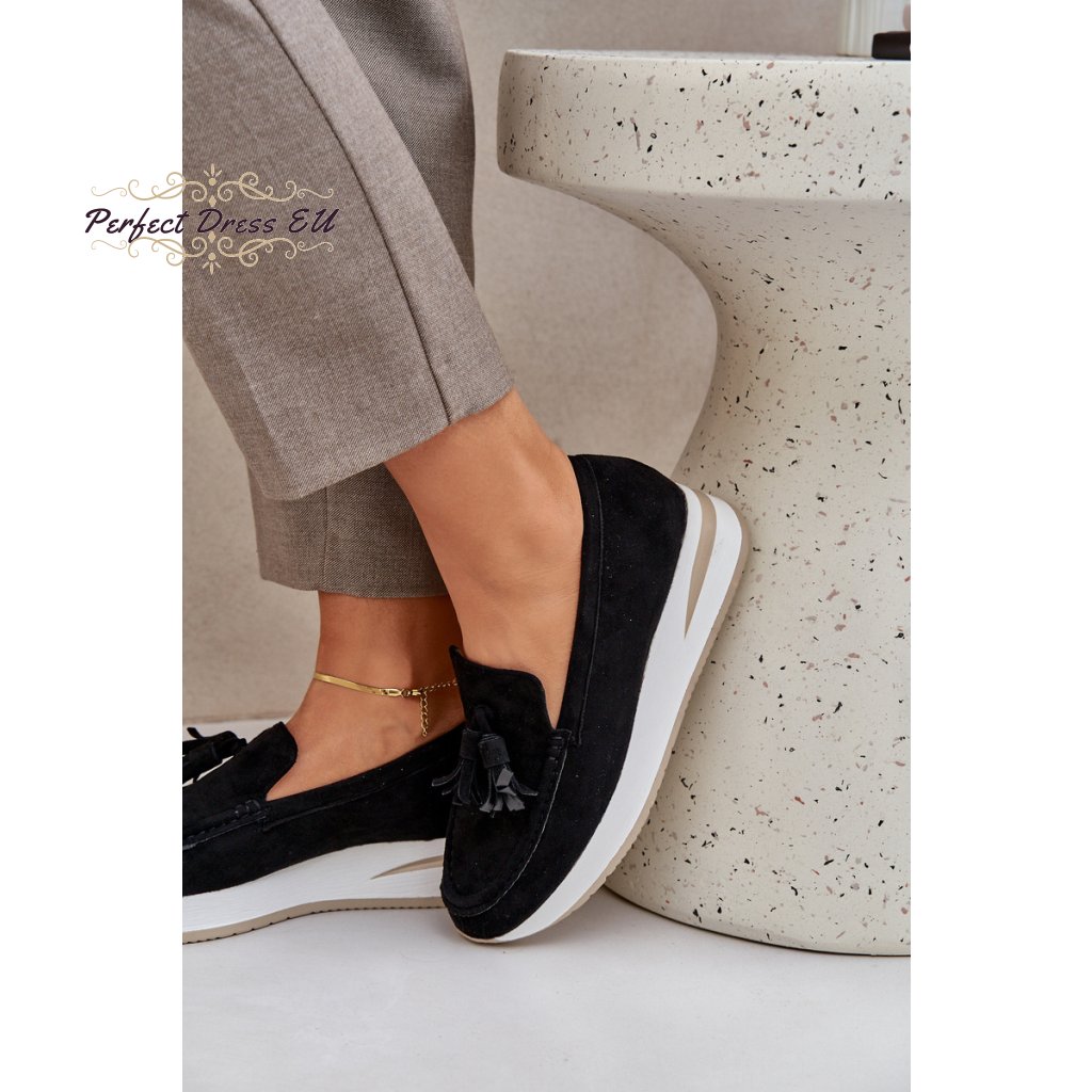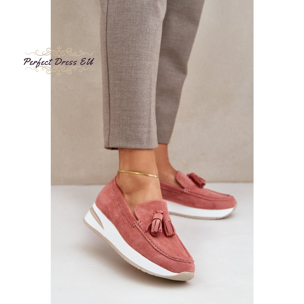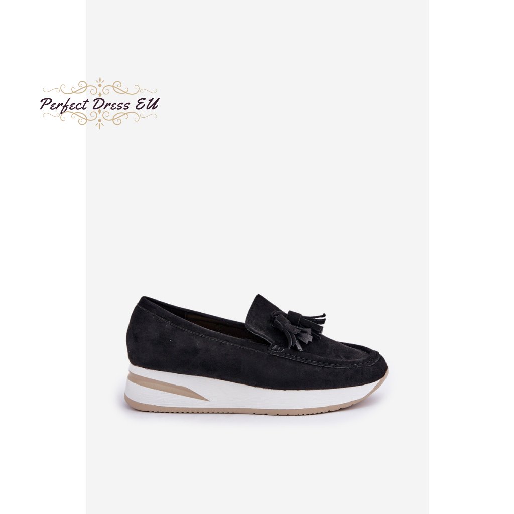 Dámské mokasíny vyrobené z eko semiše. Usazeny na platformě a jemném klínu, poskytují komfort nošení a dodávají lehkost siluetě. Zaoblené špičky zajišťují, že obuv je mimořádně pohodlná, a měkká stélka se stará o pohodlí po celý den. Celkový dojem doplňují ozdobné třásně, které dodávají botám originální charakter a styl. Ideální pro každodenní styling! Při výběru velikosti se řiďte tabulkou velikostí.