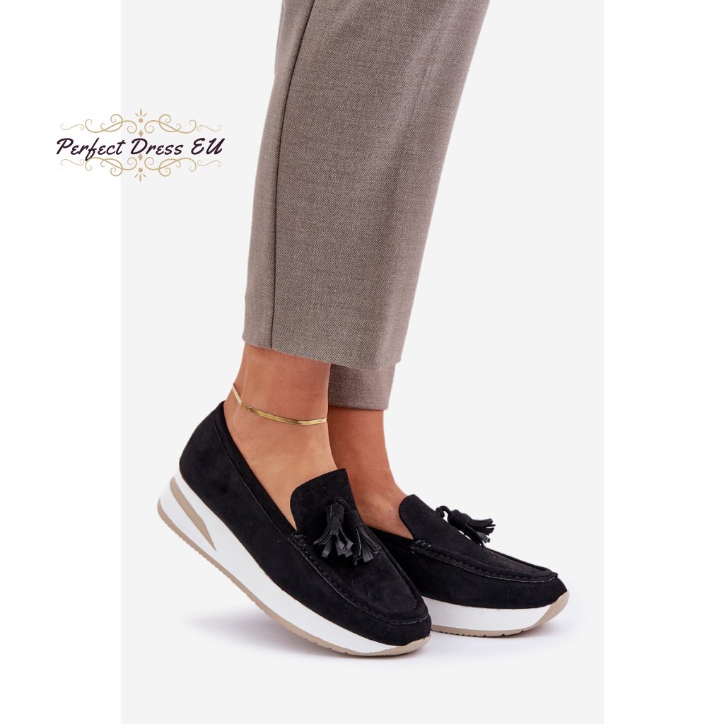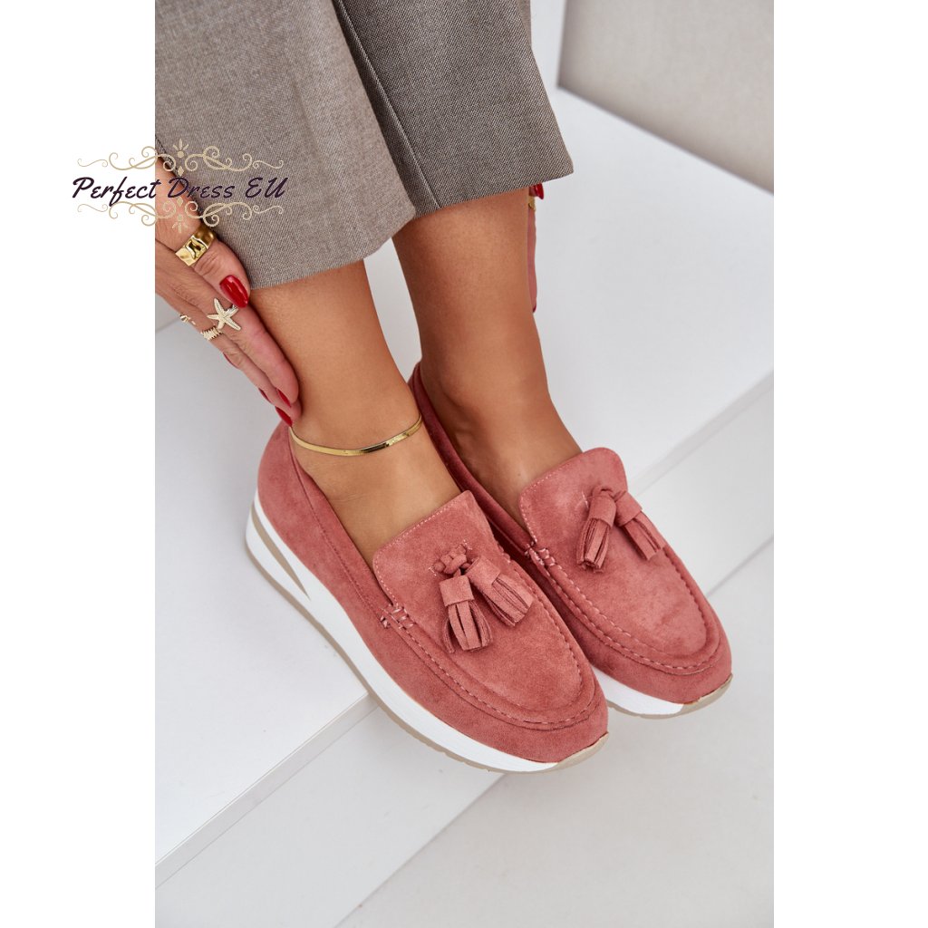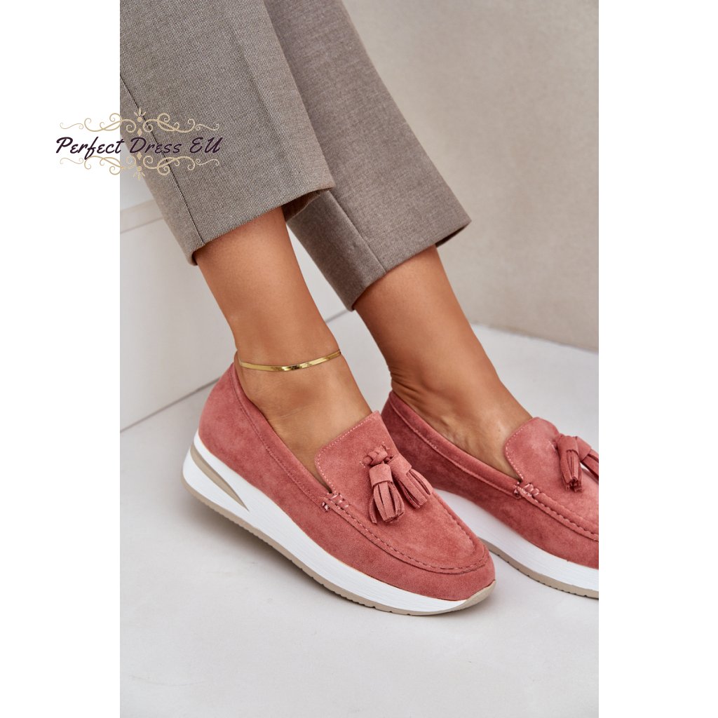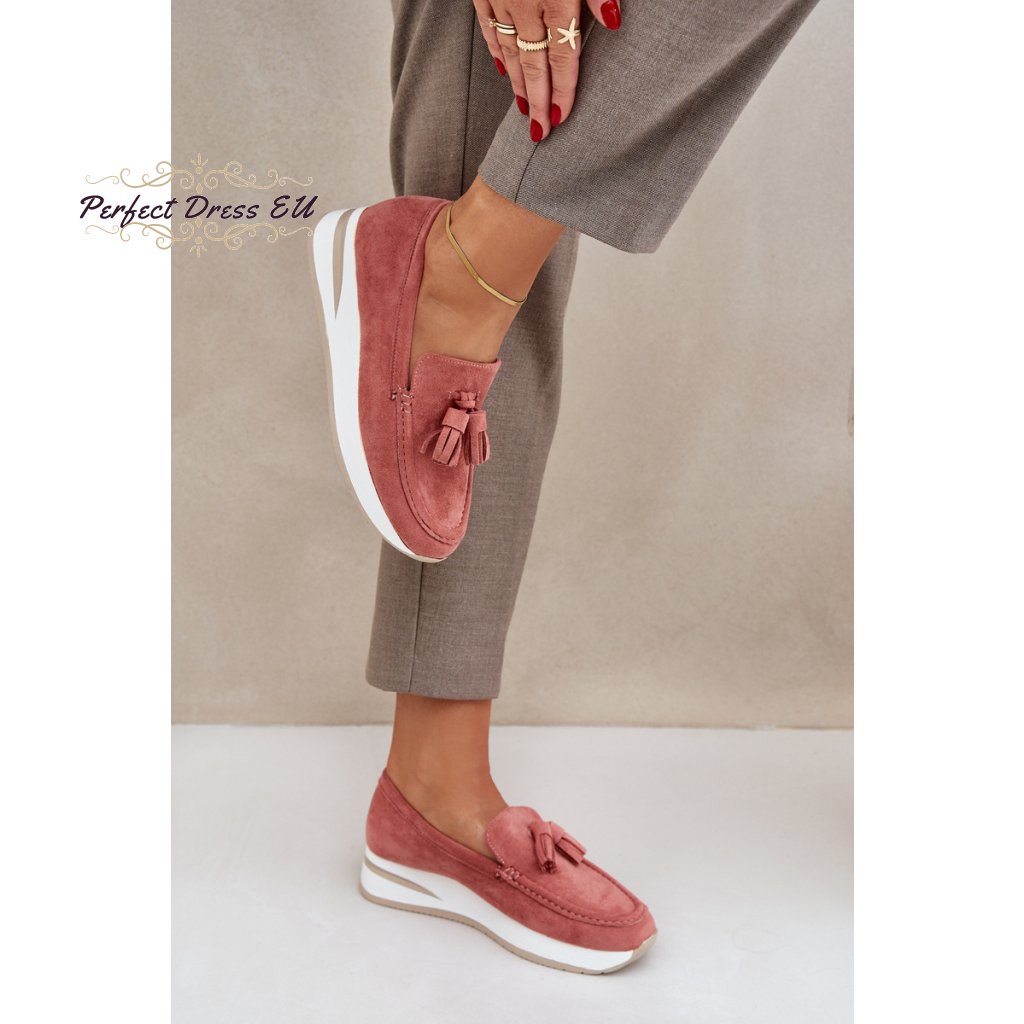 Dámské mokasíny vyrobené z eko semiše. Usazeny na platformě a jemném klínu, poskytují komfort nošení a dodávají lehkost siluetě. Zaoblené špičky zajišťují, že obuv je mimořádně pohodlná, a měkká stélka se stará o pohodlí po celý den. Celkový dojem doplňují ozdobné třásně, které dodávají botám originální charakter a styl. Ideální pro každodenní styling! Při výběru velikosti se řiďte tabulkou velikostí.