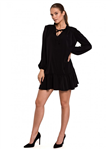 Získejte dívčí vzhled s tímto uvolněným střihem mini s nádherným výstřihem. Volánková spodní část. Šaty se širokými rukávy s kravatovým detailem.