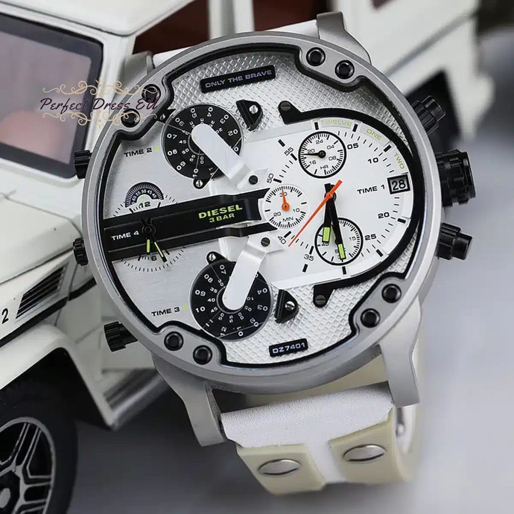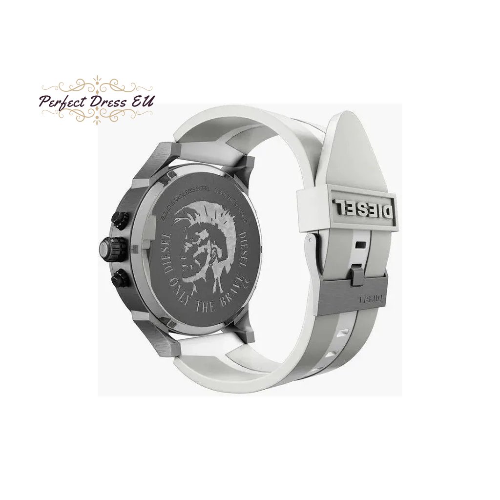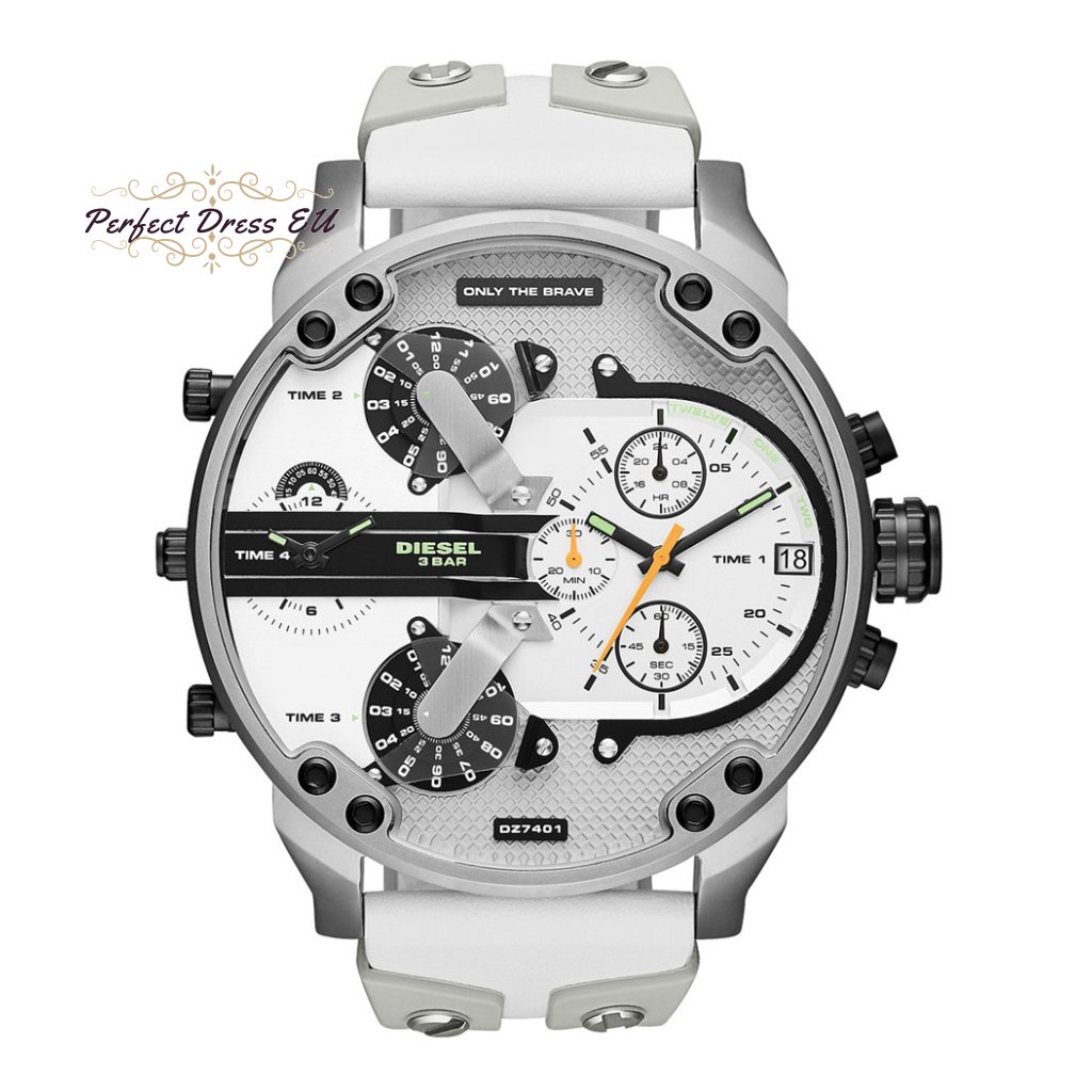 Pánské hodinky Diesel Mr. Daddy 2.0 DZ7401 jsou velké pánské hodinky. Bílošedý kožený a pryžový řemínek dokonale ladí se stříbrným pouzdrem, které je vyrobeno z hypoalergenní nerezové oceli. Číselník má 4 samostatné mechanismy pro měření času. Celý je kryt minerálním sklem, které zaručuje odolnost proti poškrábání a prasklinám. Vodotěsnost do 30 metrů chrání před stříkající vodou. Použitý quartzový mechanismus je spolehlivý. Model Diesel Mr. Daddy 2.0 DZ7401 je kombinací nenucené elegance se sportovním charakterem - musí přitahovat pozornost!