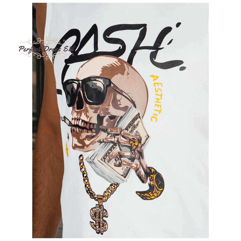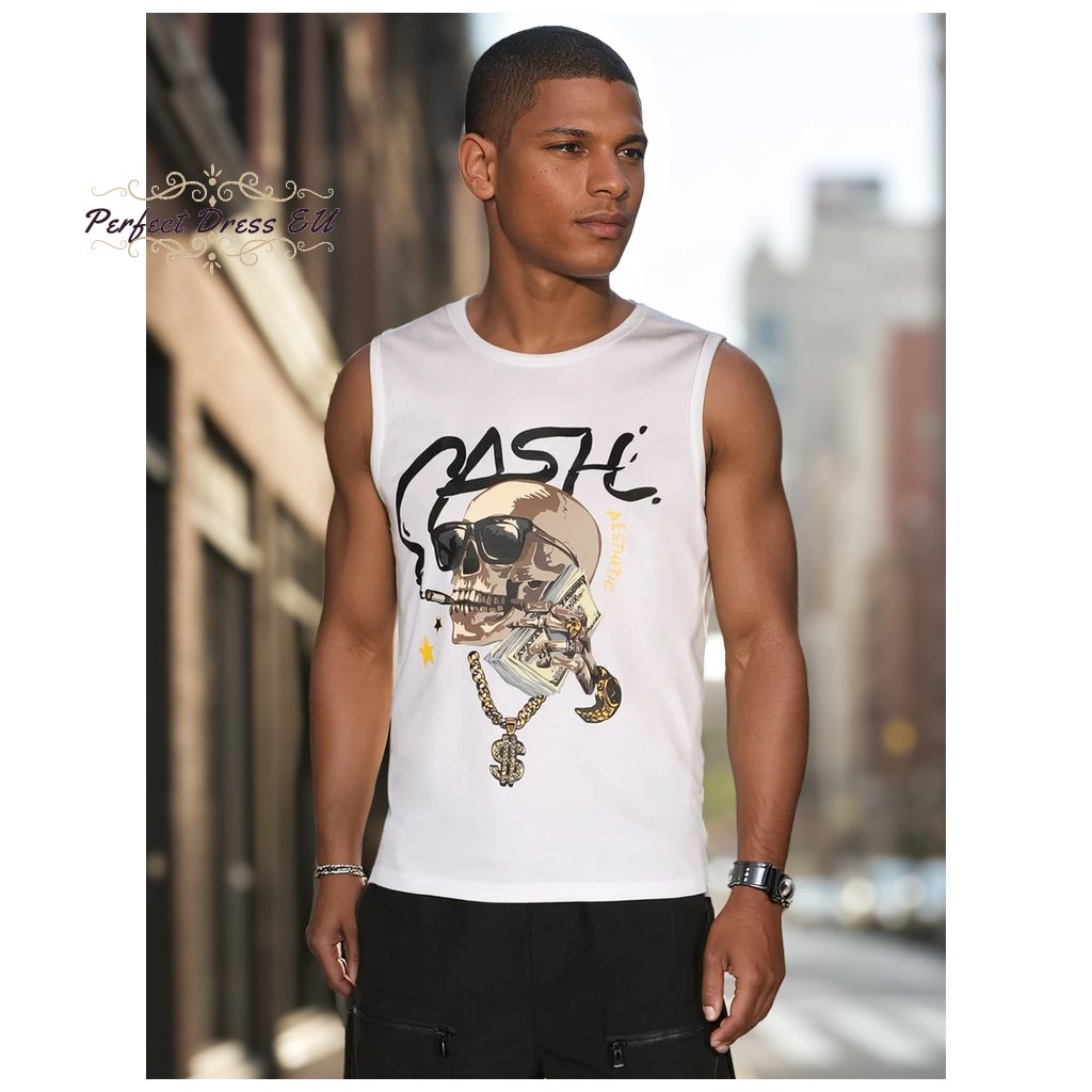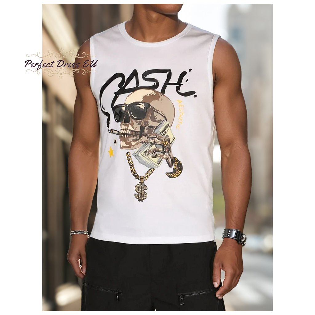 Tričko bez rukávů s potiskem v městském stylu je návrhem pro muže, kteří hledají výrazné akcenty v letních outfitech. Kulatý výstřih, klasický střih a výrazná grafika s motivem lebky a nápisem „CASH“ dodávají celému kousku módní, mladistvý charakter. Skvělé na jarní a letní procházky po městě.