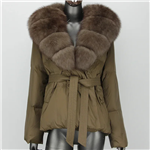 Péřová bunda s páskem a pravou liškou.Doplňkové parametry