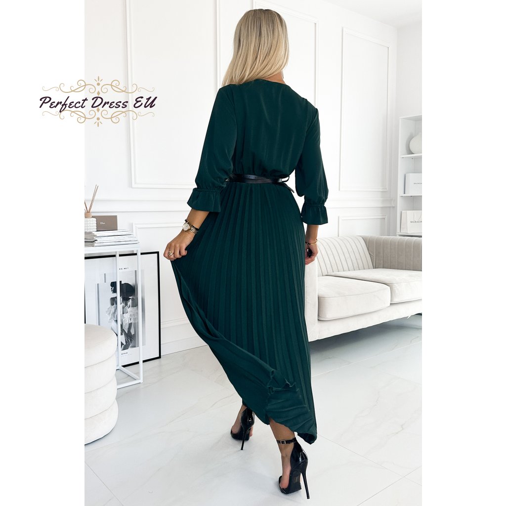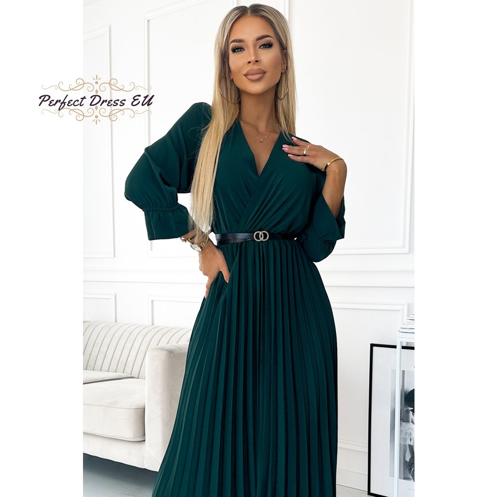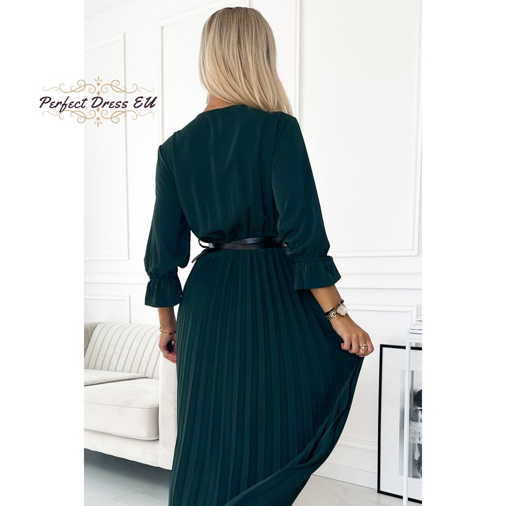 Plisované šaty s výstřihem, páskem a 3/4 rukávy