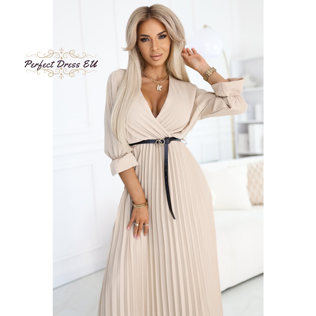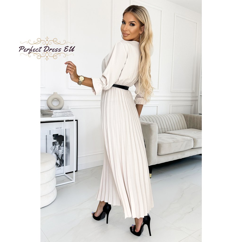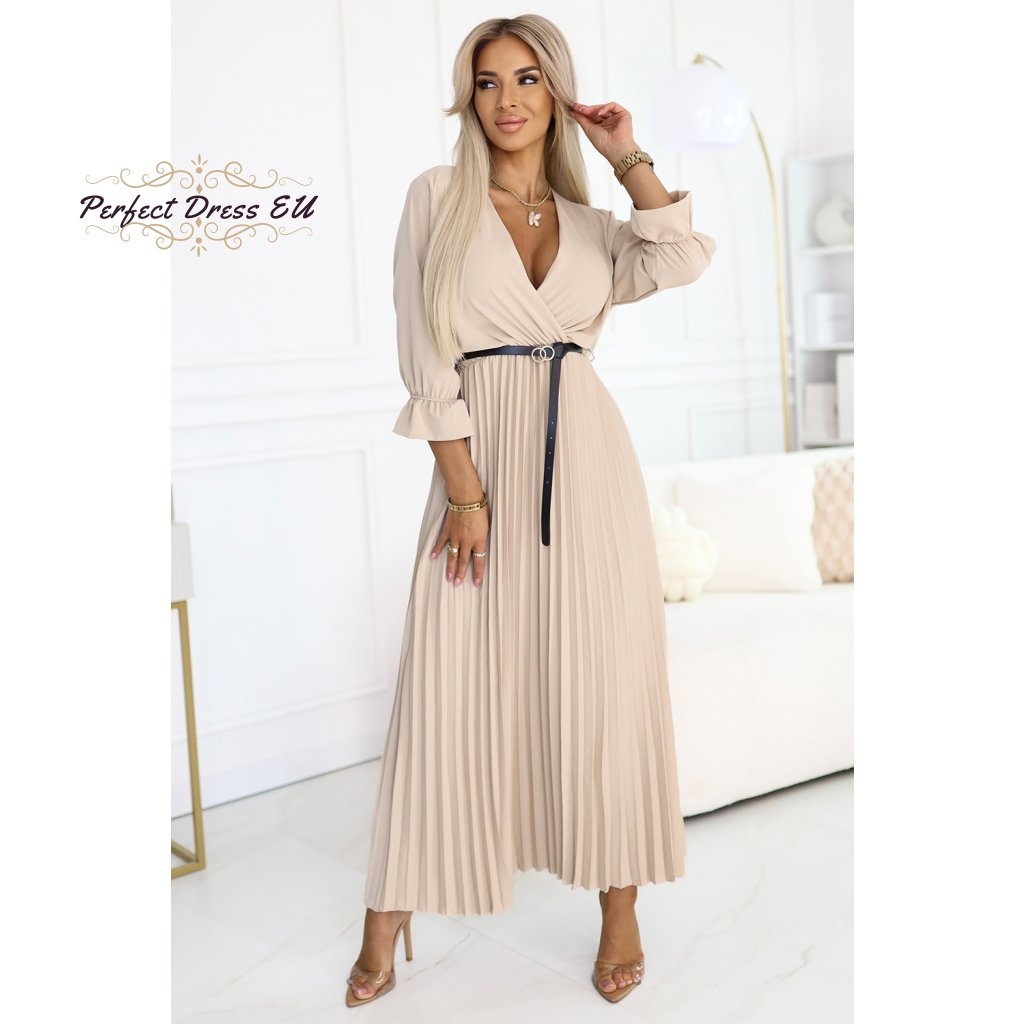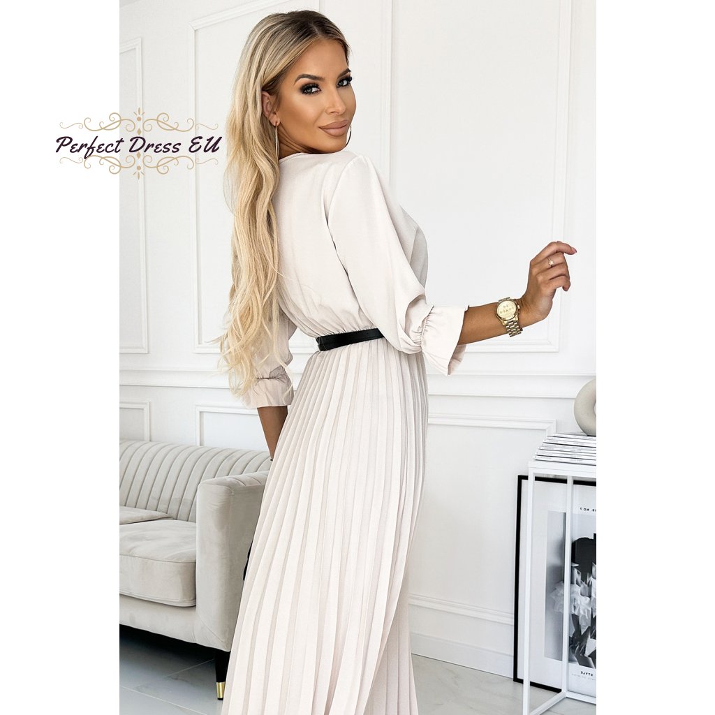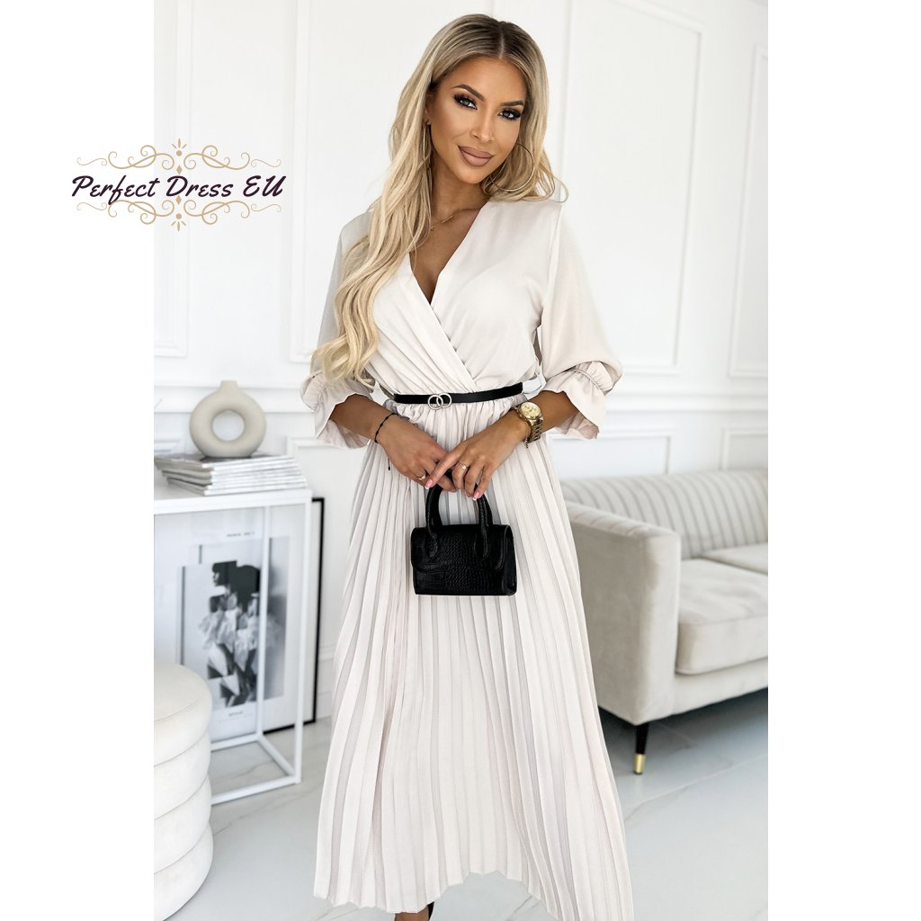 Plisované šaty SERENA s výstřihem, černým páskem a 3/4 rukávy. Vyrobeno z hladkého béžového materiálu. Perfektní šaty pro každou příležitost. Značka Numoco. evropská produkce.