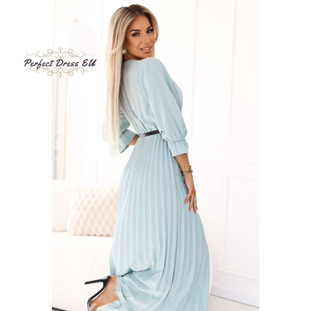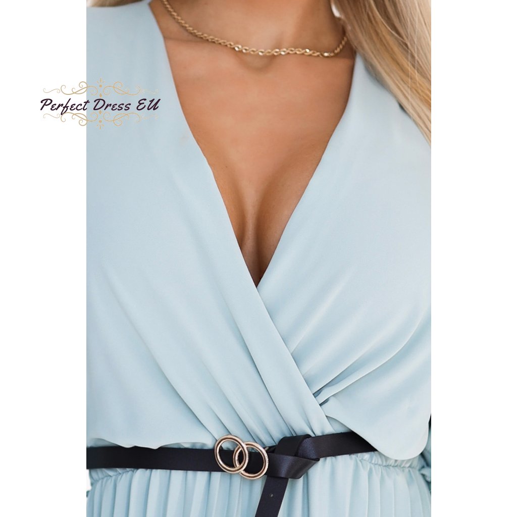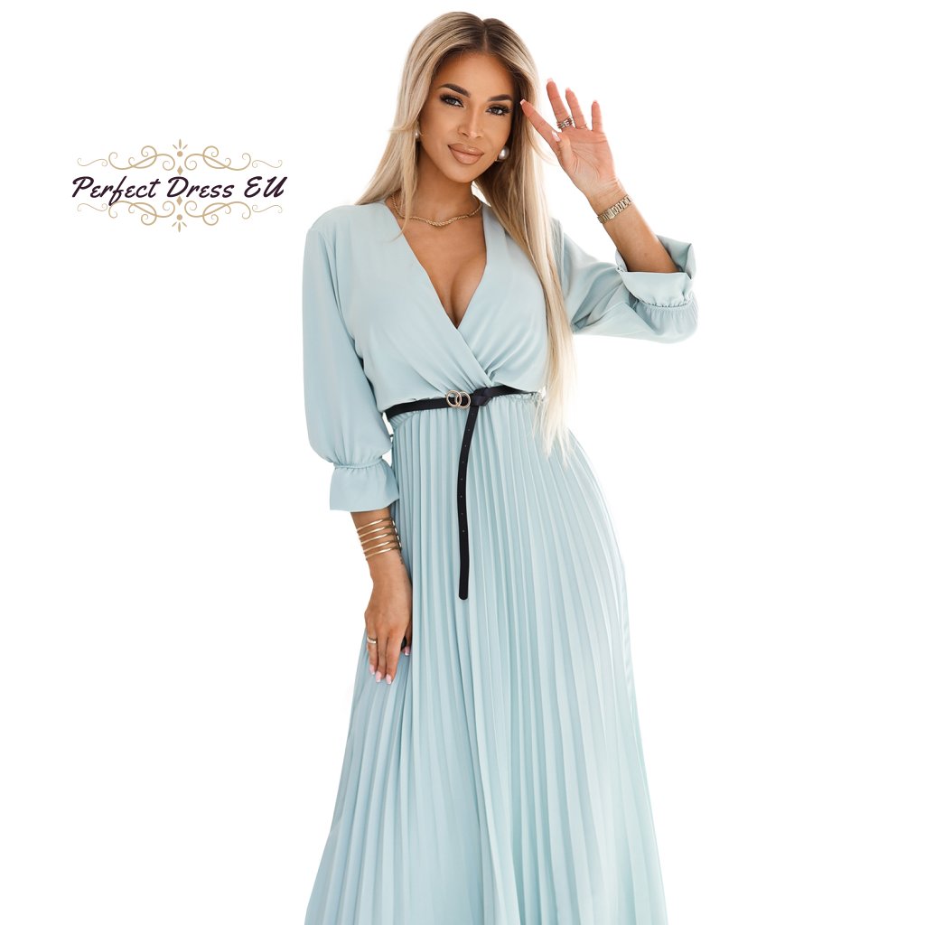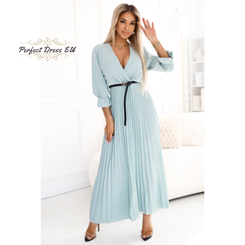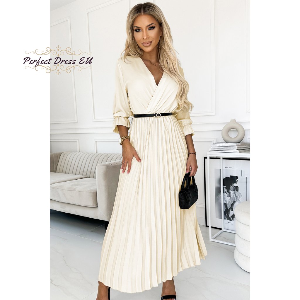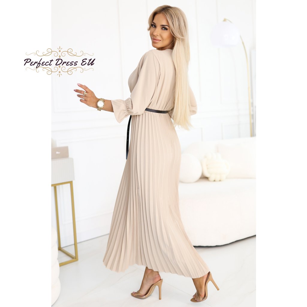 Plisované šaty SERENA s výstřihem, černým páskem a 3/4 rukávy. Vyrobeno z hladkého béžového materiálu. Perfektní šaty pro každou příležitost. Značka Numoco. evropská produkce.
