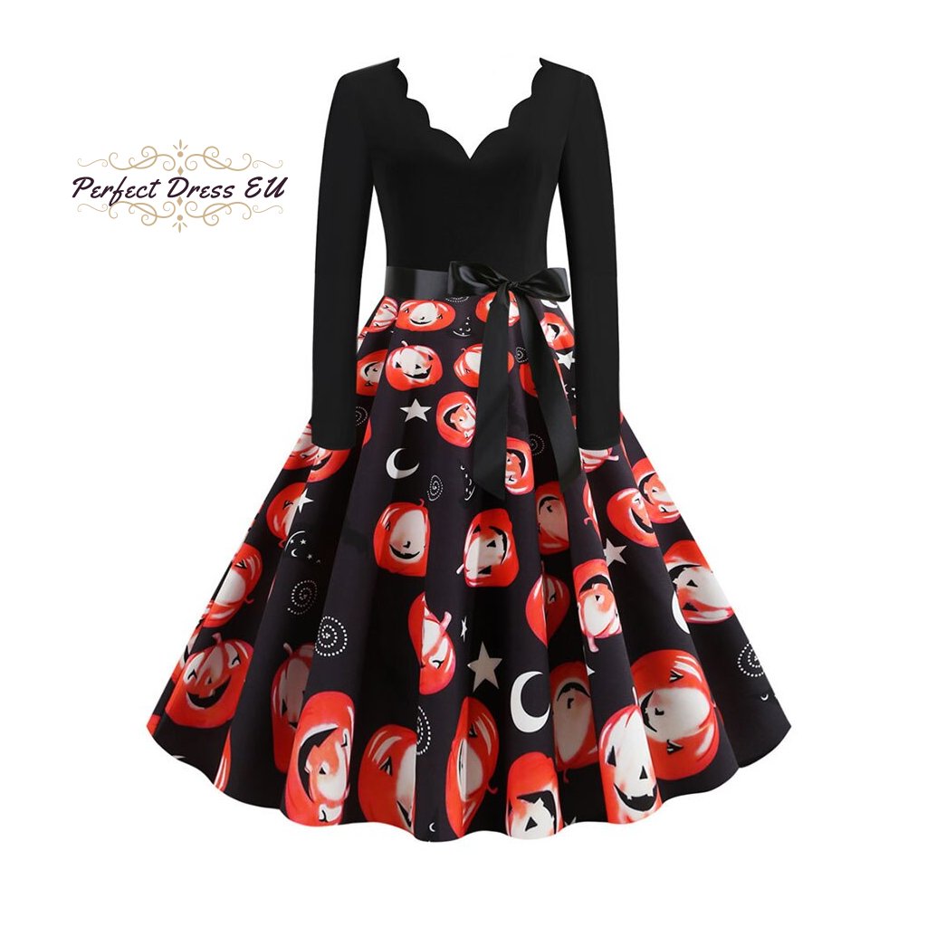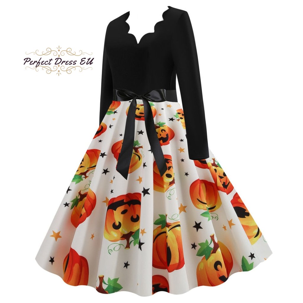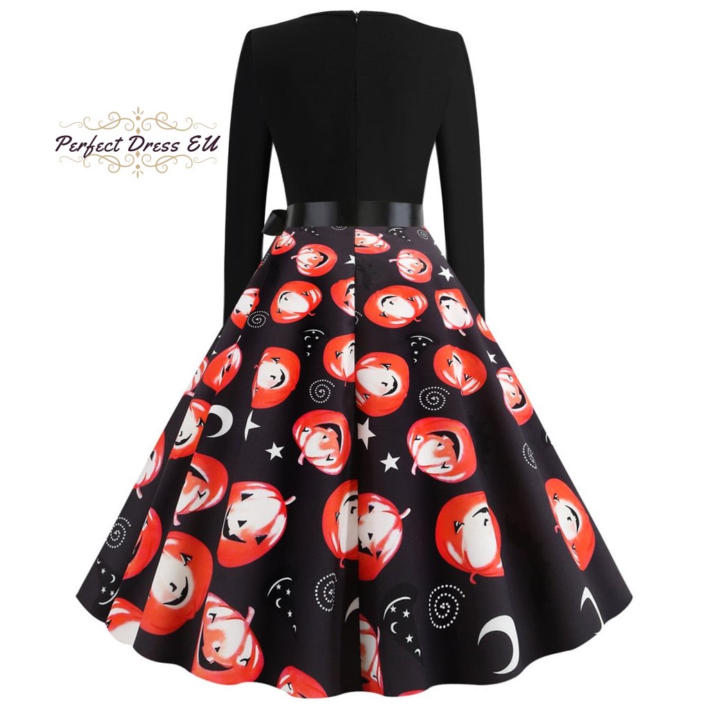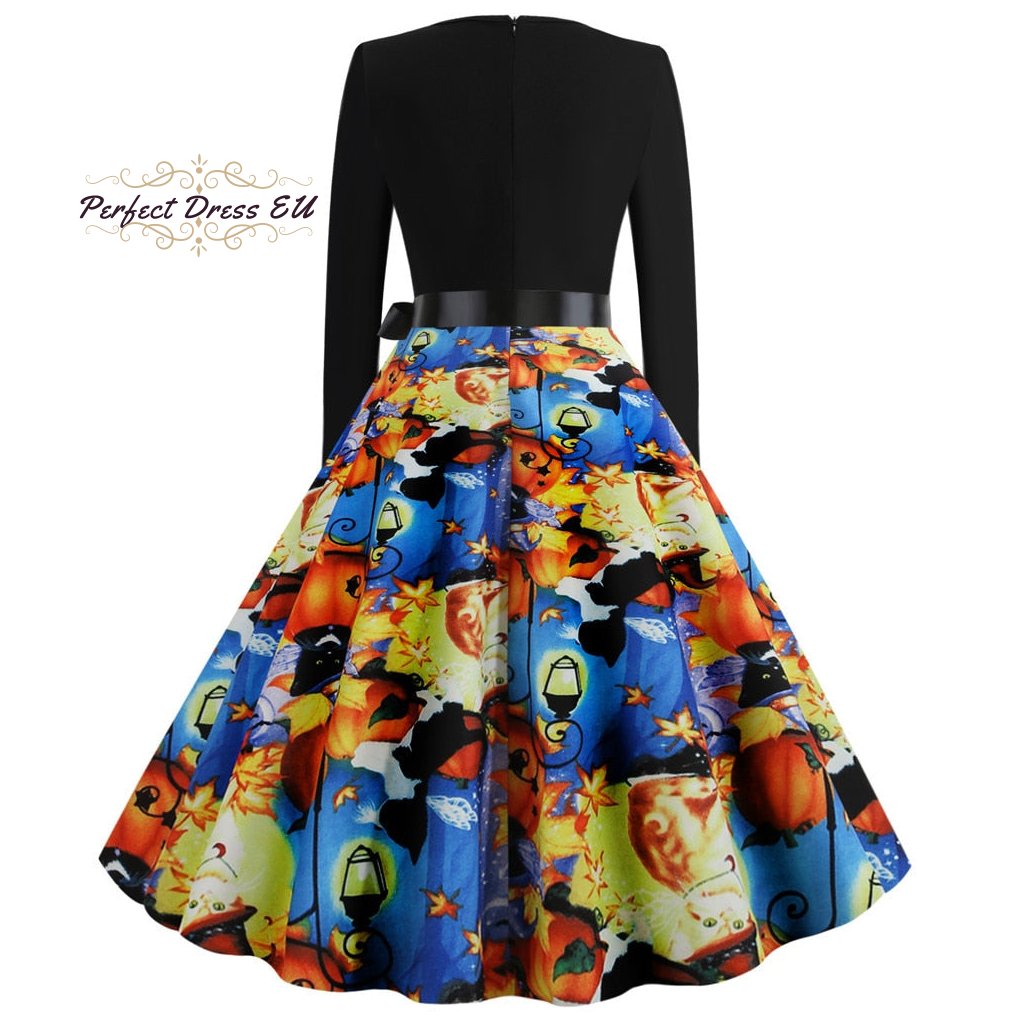 Elegantní retro šaty s dlouhými rukávy a výraznou rozšířenou sukní, která zdobená halloweenským potiskem s dýněmi, netopýry a pavučinami. Horní část je jednobarevná, hladká a má jemný vlnkovaný výstřih, který krásně zvýrazní dekolt. V pase je saténová mašle, která podtrhuje ženskou siluetu a opticky ji zúží. Šaty jsou ideální pro tematické večírky, Halloween, kostýmové akce nebo jako originální outfit pro podzimní sezónu.