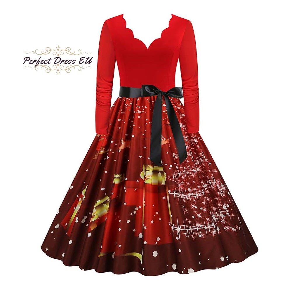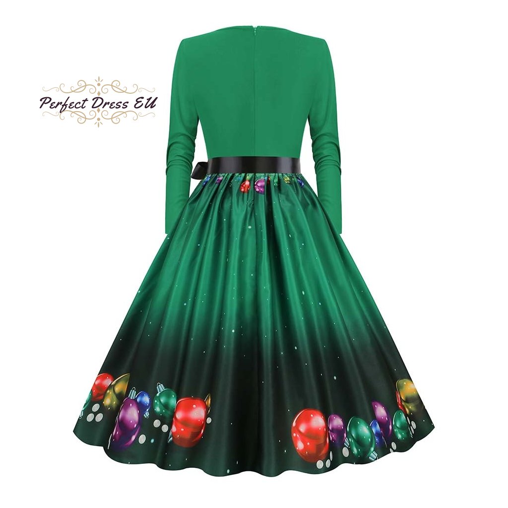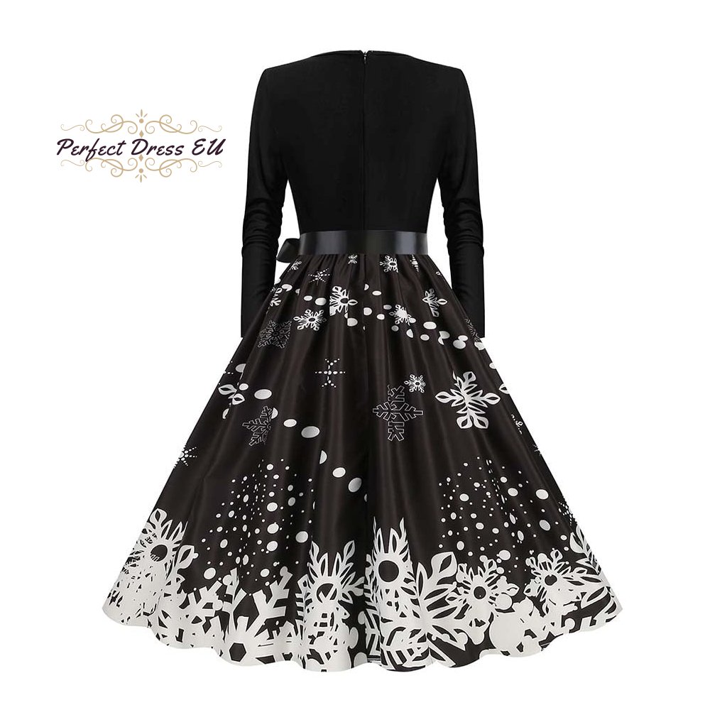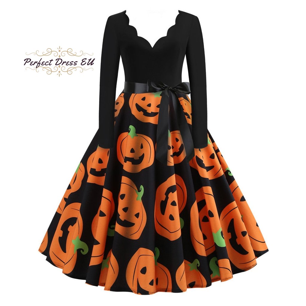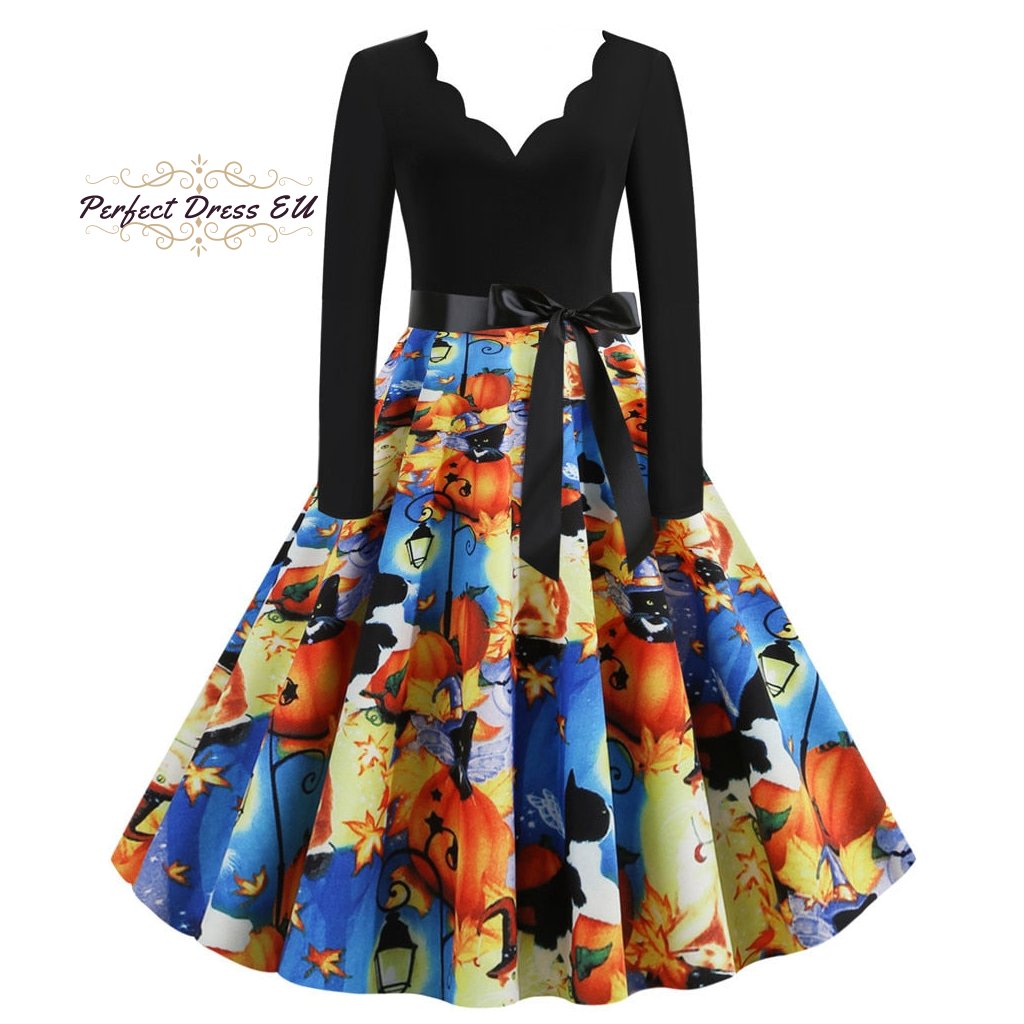 Elegantní retro šaty s dlouhými rukávy a výraznou rozšířenou sukní, která zdobená halloweenským potiskem s dýněmi, netopýry a pavučinami. Horní část je jednobarevná, hladká a má jemný vlnkovaný výstřih, který krásně zvýrazní dekolt. V pase je saténová mašle, která podtrhuje ženskou siluetu a opticky ji zúží. Šaty jsou ideální pro tematické večírky, Halloween, kostýmové akce nebo jako originální outfit pro podzimní sezónu.