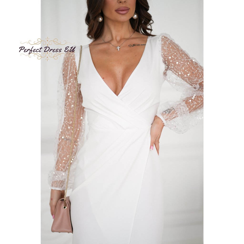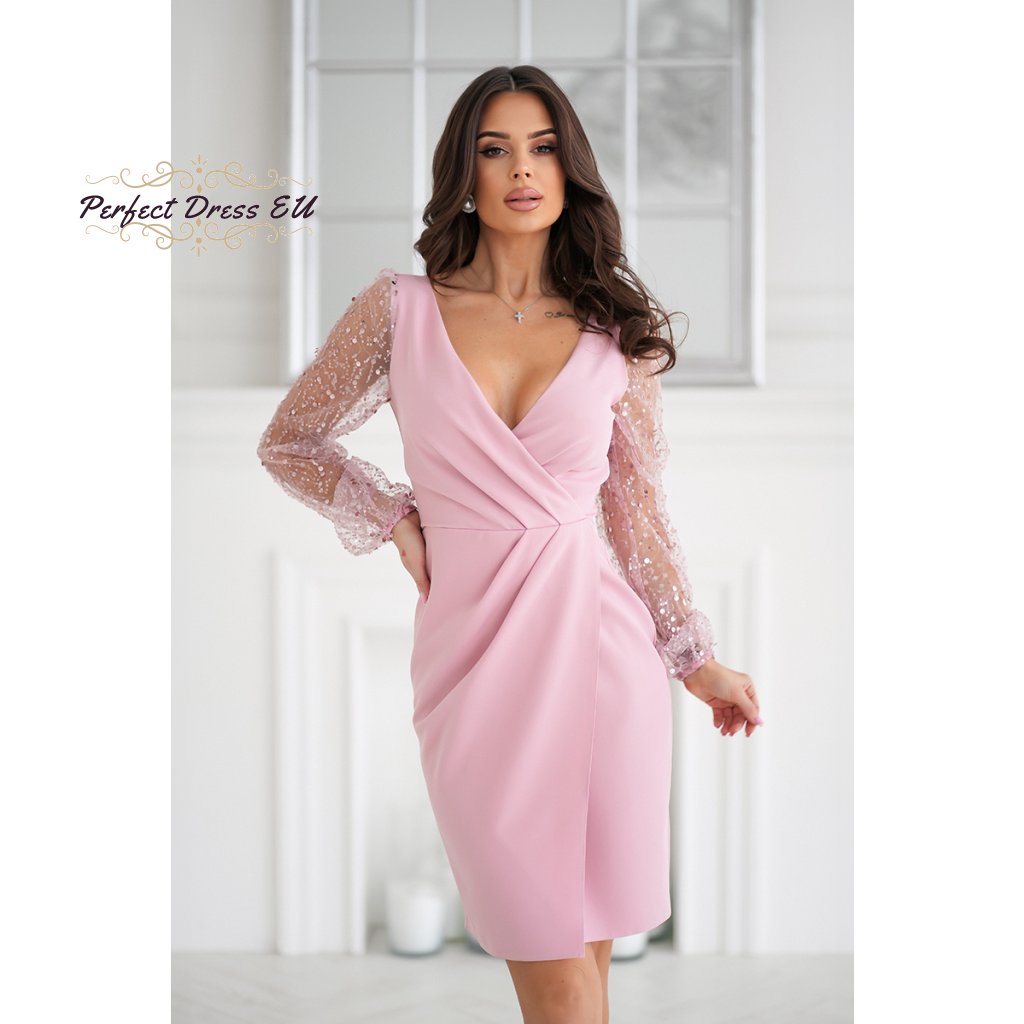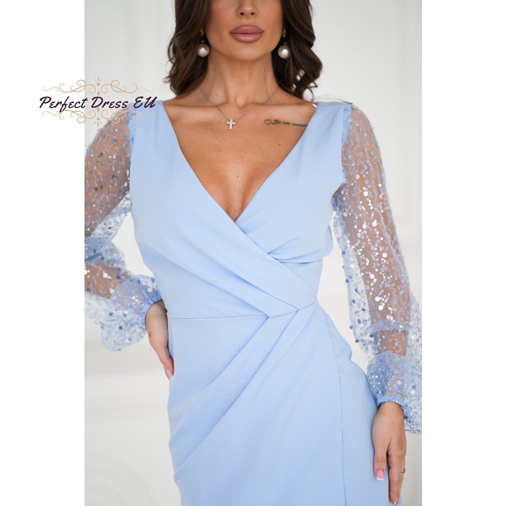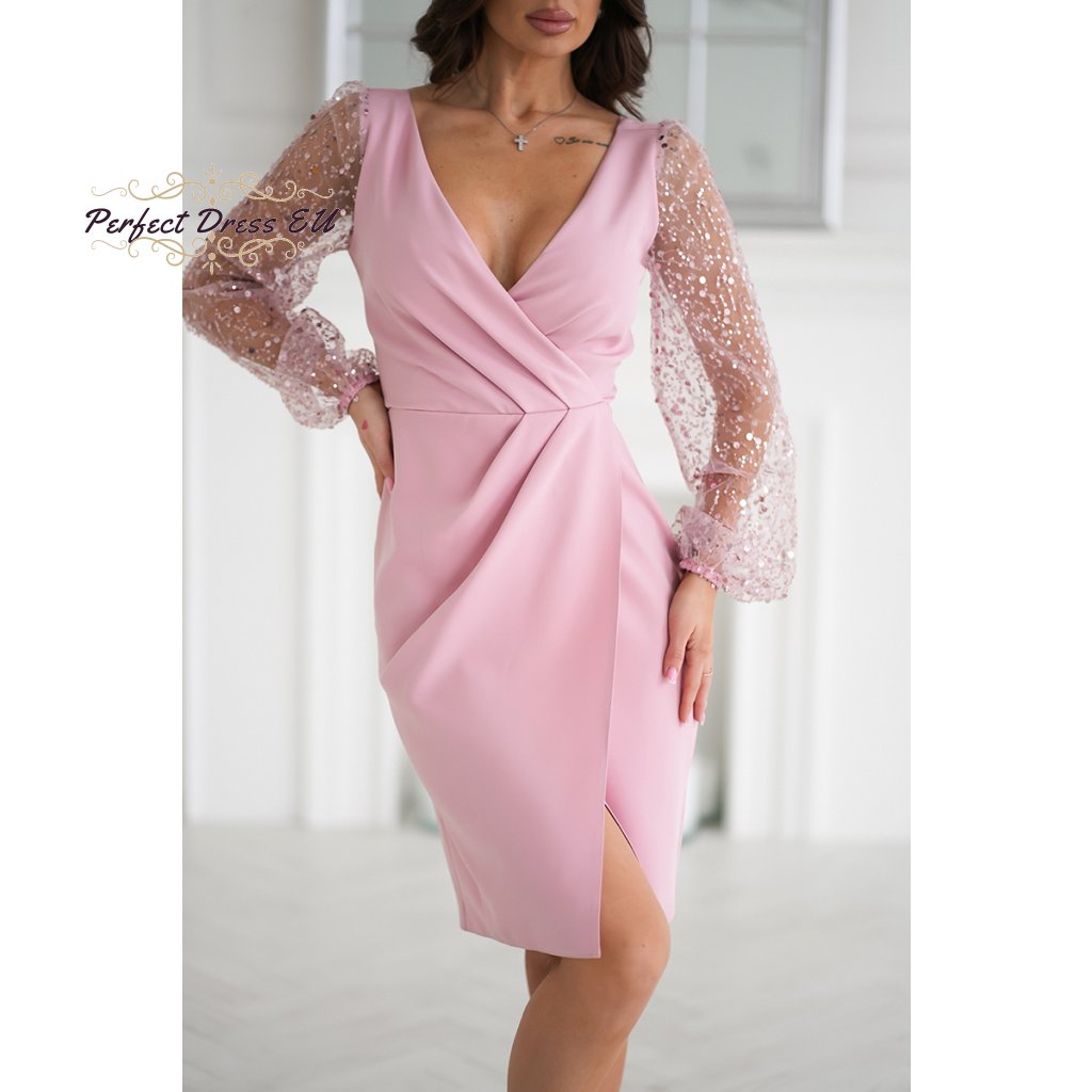 Fenomenální kreace se dvěma flitrovými rukávy. Jemný, sýrový výstřih lehce odhaluje poprsí. Spodní část šatů je vrstvená. Flitrované rukávy dodávají šarm a šik a jsou dokonalým doplňkem outfitu. Dostupné v krásných barvách.