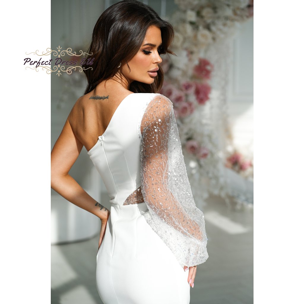 Saténové flitrové šaty s volánovým rukávem a asymetrickým lemem