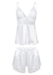 Set Ola je kombinací světlého ecru saténu s černou krajkou. Toto barevné členění působí mimořádným dojmem. Náš set se skládá z tílka s tenkými ramínky, které má v horní části krajkovou vložku, která decentně ukazuje trochu více těla. Spodní část kompletu tvoří saténové kraťasy ve světlé ecru barvě s krajkou ve spodní části. Celé to působí velmi elegantně a glamour.