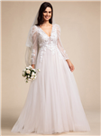 Tyto nádherné tylové svatební šaty s výstřihem do V, vyrobené s pečlivou pozorností k detailu, mají Dlouhé rukávy zdobené jemným zdobením aplikací, které dodávají punc vintage šarmu. Ladná silueta lichotí každé křivce, zatímco splývavý tylový Materiál vytváří snový, éterický efekt. Ideální pro nevěstu, která ve svůj výjimečný den hledá nadčasový a sofistikovaný vzhled.