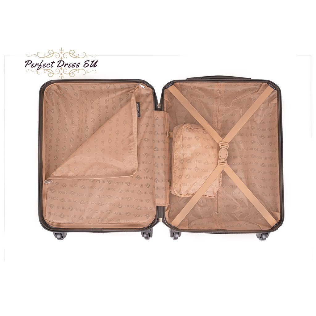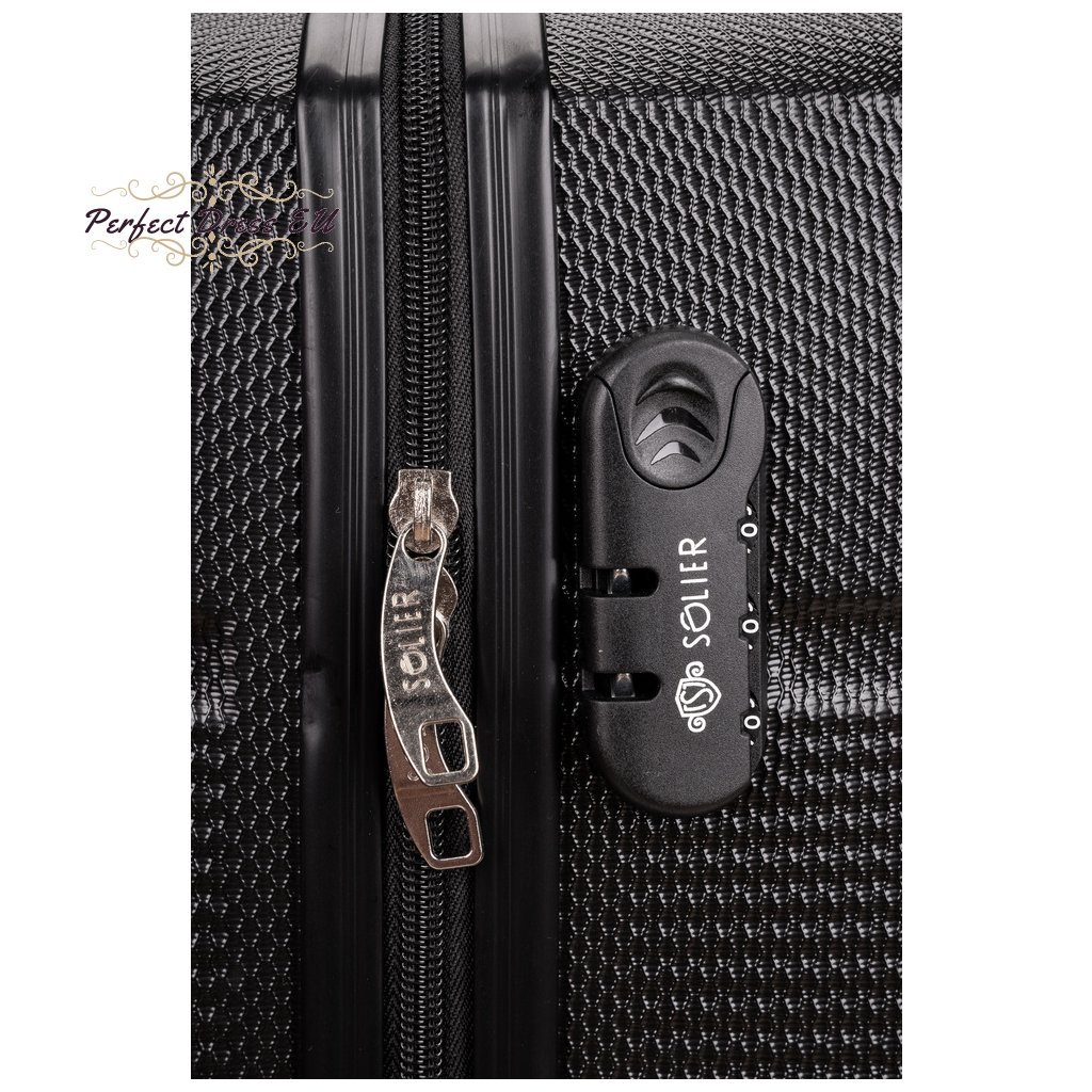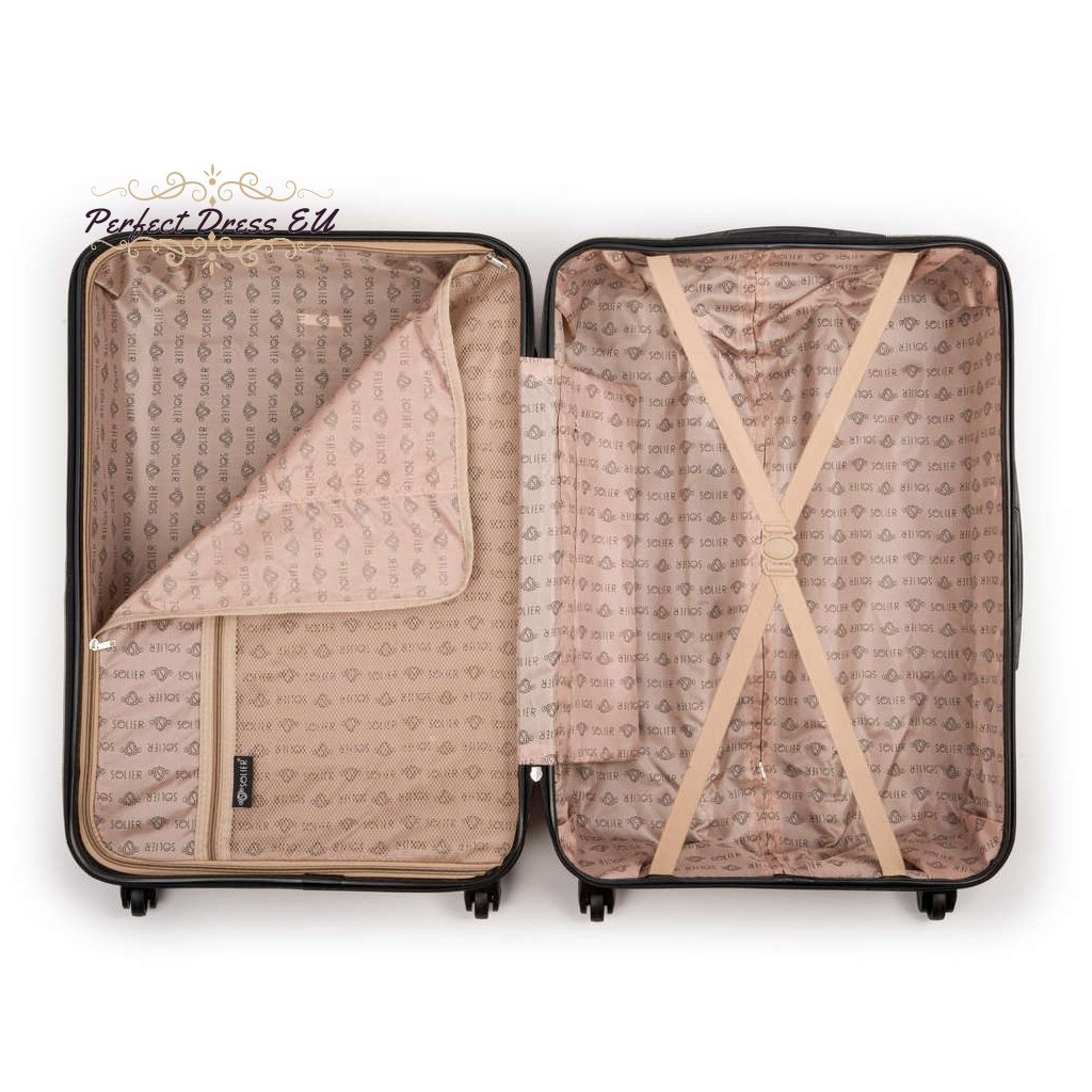 - Kufr SOLIER je navržen speciálně pro náročné zákazníky. Moderní a lehký model je vyroben z pevné a odolné tkaniny (ABS Plus) s teleskopickou rukojetí. Kufr je vybaven kódovým zámkem, který chrání vaše věci před krádeží. Čtyři kaučuková kolečka zaručují stabilitu a lehkost. Interiér je vybaven signovanou podšívkou rozdělenou zipem na dvě komory.